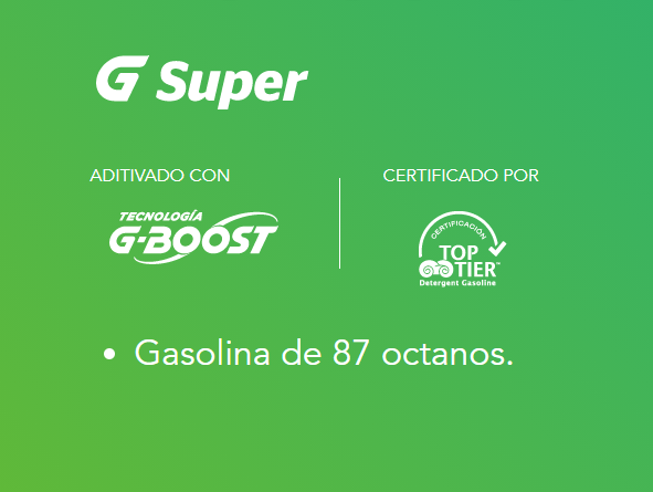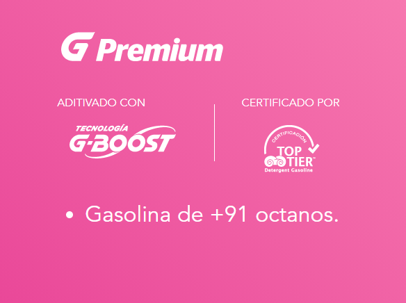 Todas nuestras gasolinas cuentan con la tecnología G-Boost que es un aditivo formulado para limpiar la cámara de combustión de tu motor para así recuperar su desempeño, prolongar su tiempo de vida, reducir las emisiones que libera y optimizar la economía de combustible.